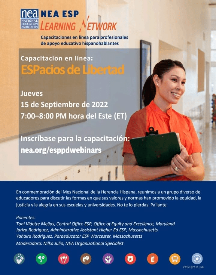 This month, the NEA ESP Learning network is excited to offer learning webinars for education support professionals, including a webinar on Thursday, September 15, that will be presented in Spanish.