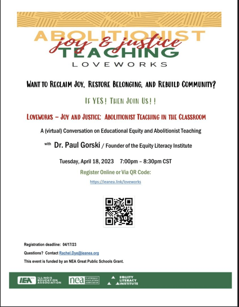 UncategorizedTonight! Don’t miss this event! Register now! April 18, 2023 ieaesp Loveworks – Joy and Justice: Abolitionist Teaching in the ClassroomRegister Online or Via QR Code:htps://ieanea.link/loveworks Share this: Click to share on X (Opens in new window) X Click to share on Facebook (Opens in new window) Facebook Like Loading... Related