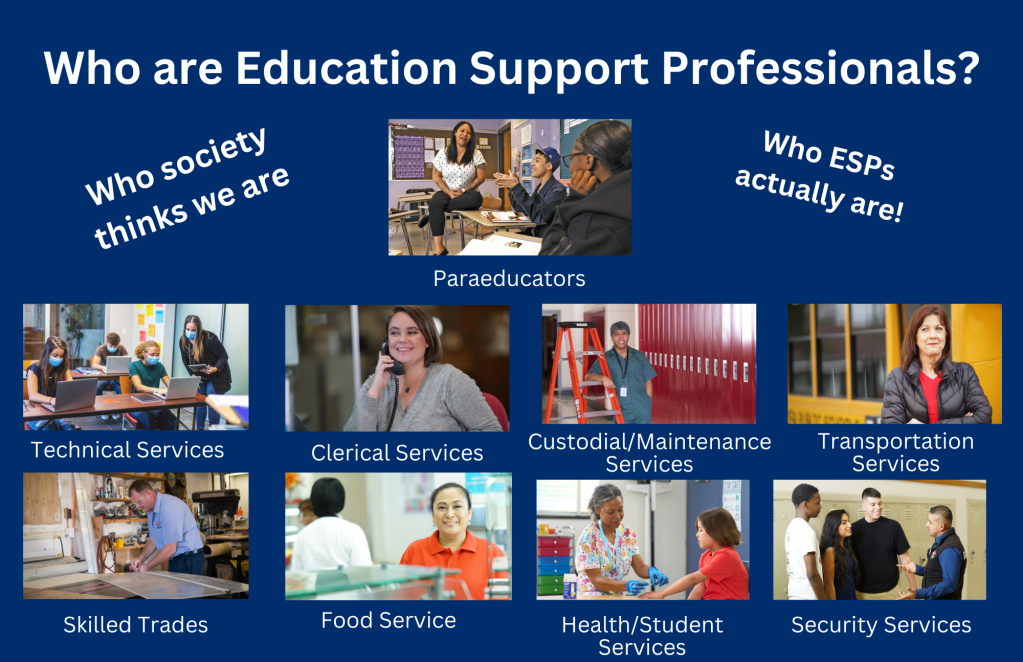 Education Support Professionals are essential to a high quality public education. ESPs are often the first to arrive and last to leave while supporting students health, safety, and academic success.